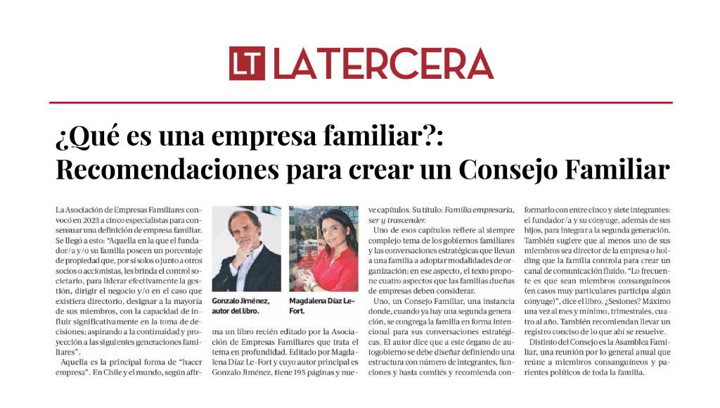 La Tercera destacó el aporte y contenido de esta obra escrita por el presidente de Proteus, académico PUC y consultor de empresas familiares, Gonzalo Jiménez Seminario; junto a la gerenta general de la AEF, Magdalena Díaz Le-Fort.