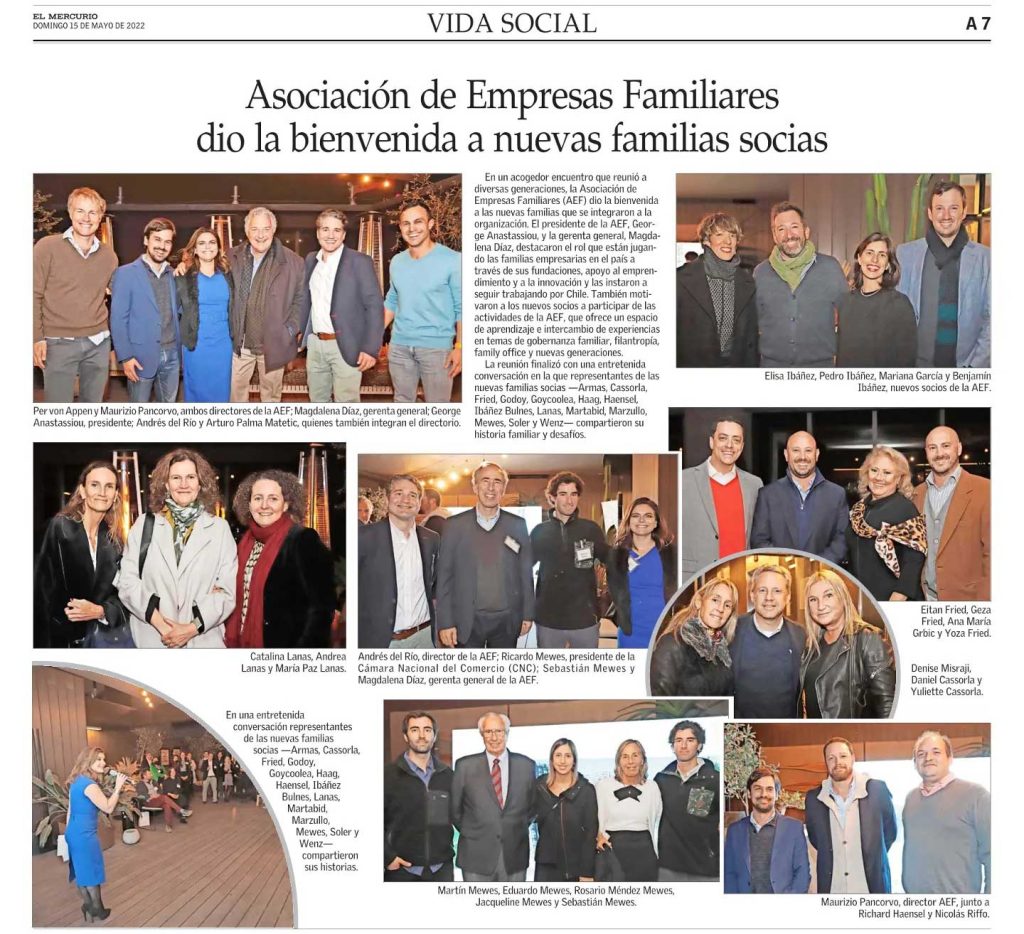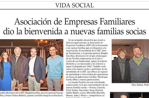 En un acogedor encuentro, la Asociación de Empresas Familiares le dio la bienvenida a las nuevas familias socias que acaban de integrarse, actividad en la que junto con agradecer su aporte se les invitó a trabajar comprometidamente por su desarrollo y evolución del país.