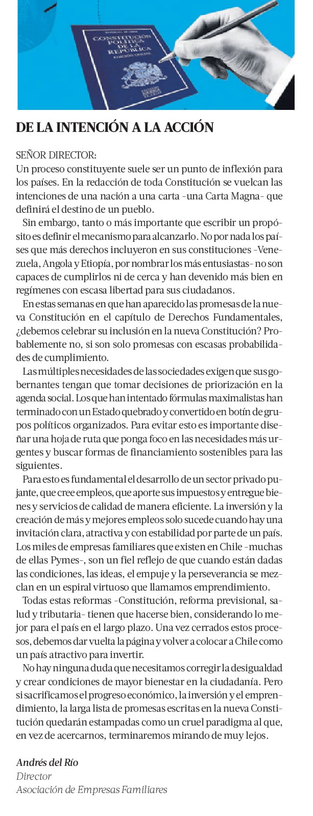 El director de la AEF, Andrés del Río, analizó el proceso constituyente destacando la necesidad de promover el progreso económico, la inversión y el emprendimiento, conceptos contenidos en una carta al director que fue publicada en La Tercera.