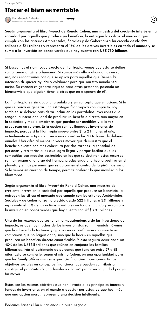 “Hacer el bien es rentable”. Ese es el nombre de la columna en la que la integrante del Directorio AEF opina sobre la importancia de las inversiones de impacto y sobre cómo estas se conectan con el tema de la filantropía.