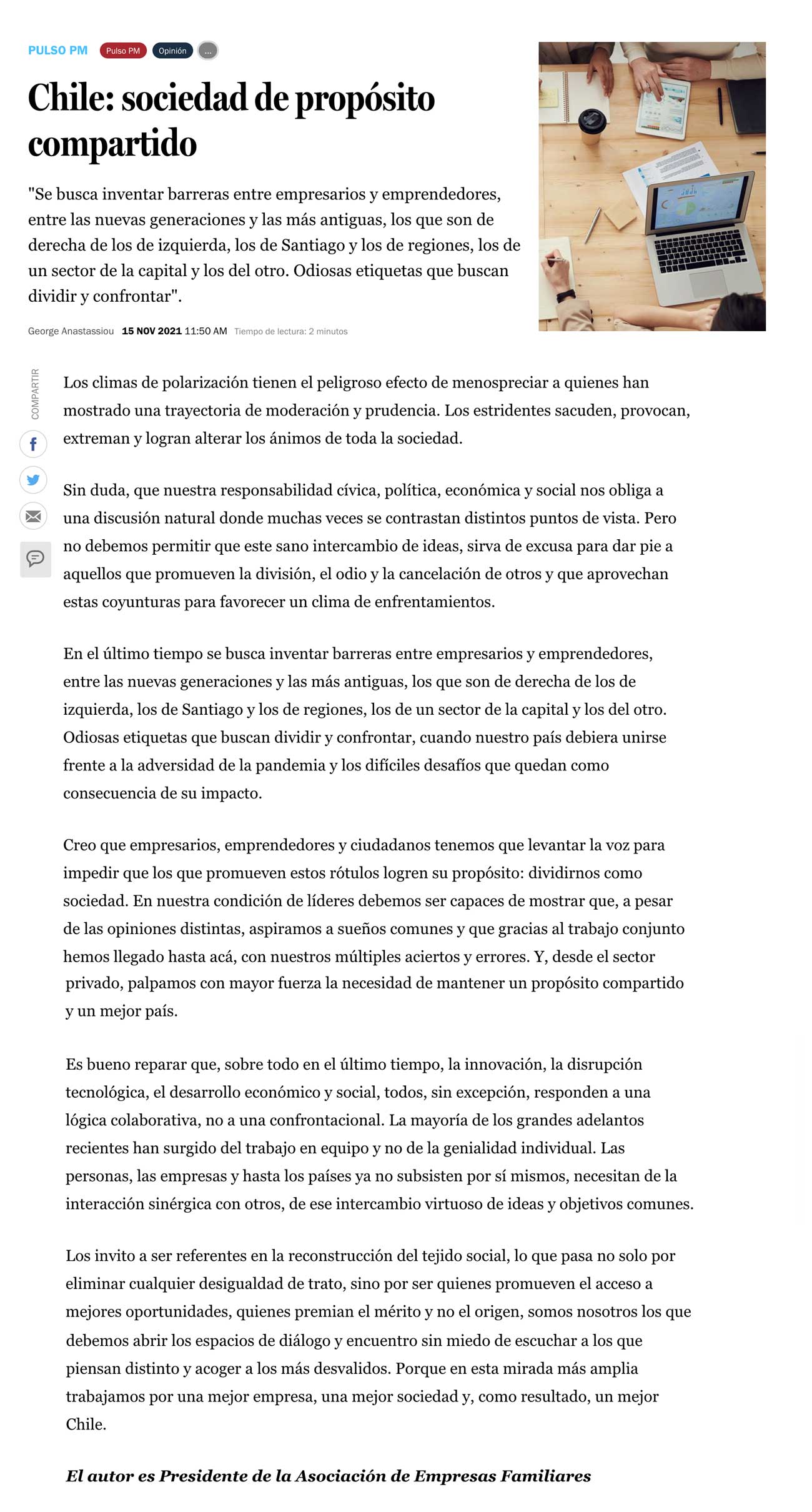 Columna del Presidente de la AEF en Pulso