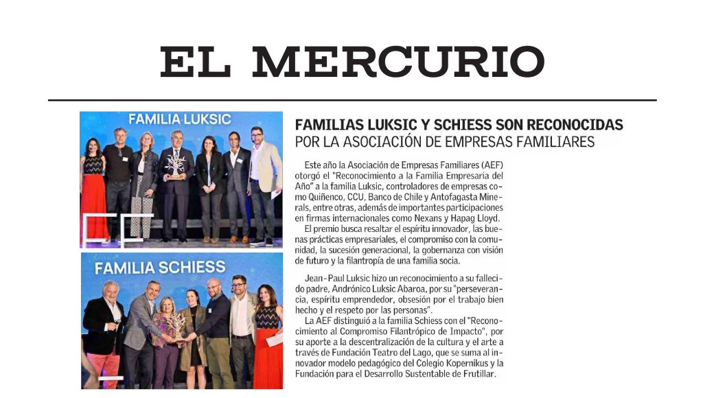 El Mercurio -Economía y Negocios y Vida Social-, además de otros portales y medios regionales, consignaron el “Reconocimiento a la Familia Empresaria del Año” -premio otorgado anualmente por la AEF- a la familia Luksic y Schiess, exponiendo diferentes fotos del evento realizado en el Club de Polo San Cristóbal, donde se realizó un llamado a fortalecer la confianza al interior de las empresas en la sociedad. Asimismo, se distinguió al empresario de la Región de Valparaíso, Eduardo Mewes, con el “Reconocimiento a la Trayectoria Empresarial”.