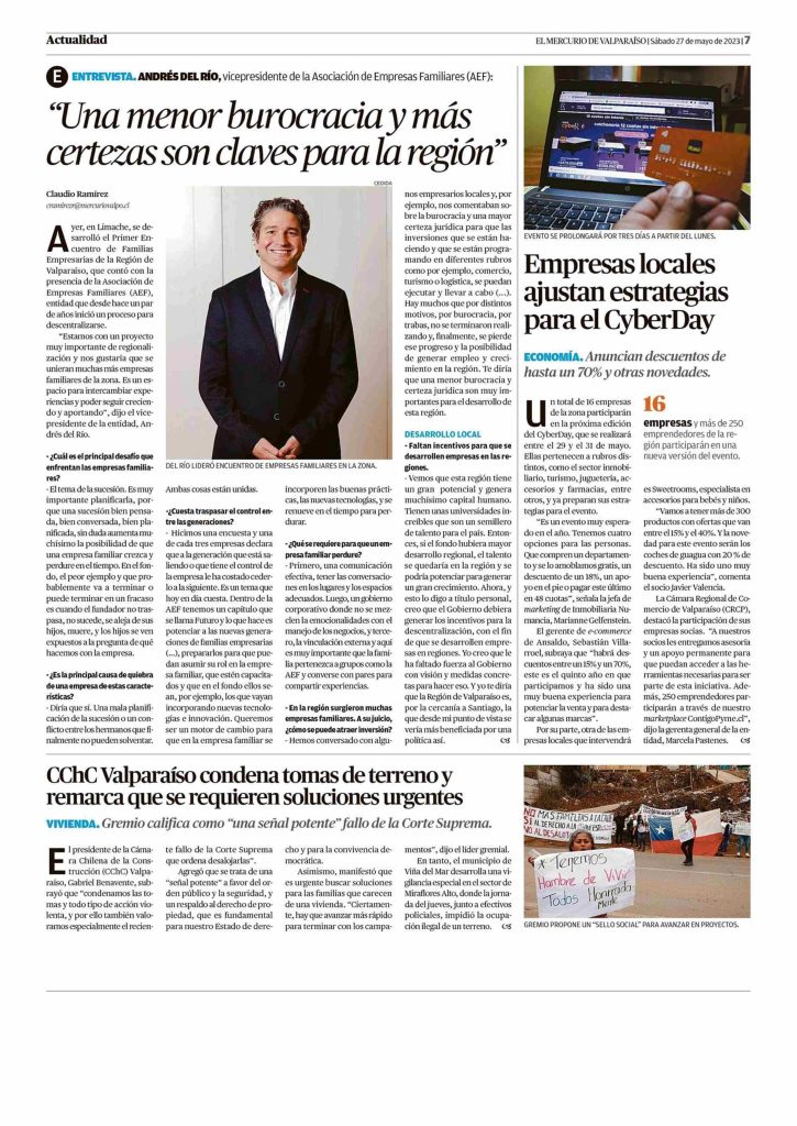 En entrevista con El Mercurio de Valparaíso, Andrés del Río, entregó detalles sobre el Encuentro de Familias Empresarias de la Región de Valparaíso y acerca de cómo las familias AEF contribuyen al desarrollo de Chile.